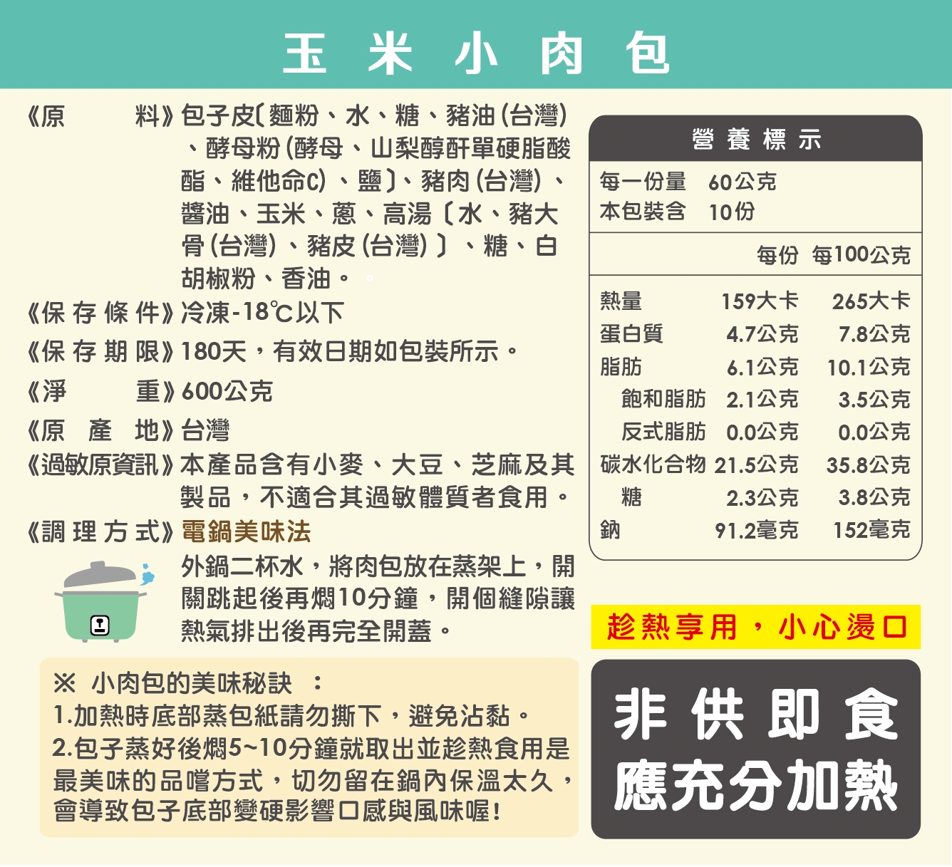 1.以上調理方式為冷藏包子的蒸煮時間,如要蒸煮冷涷包子,水量須為2倍!